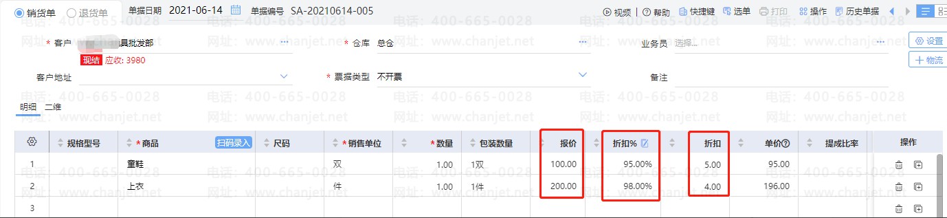 2.填制一张销货单,第1行商品【报价】输入100,【折扣%】输入95,自动算出【折扣】5,第2行商品【报价】输入200,【折扣%】输入98,自动算出【折扣】4:
