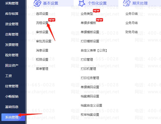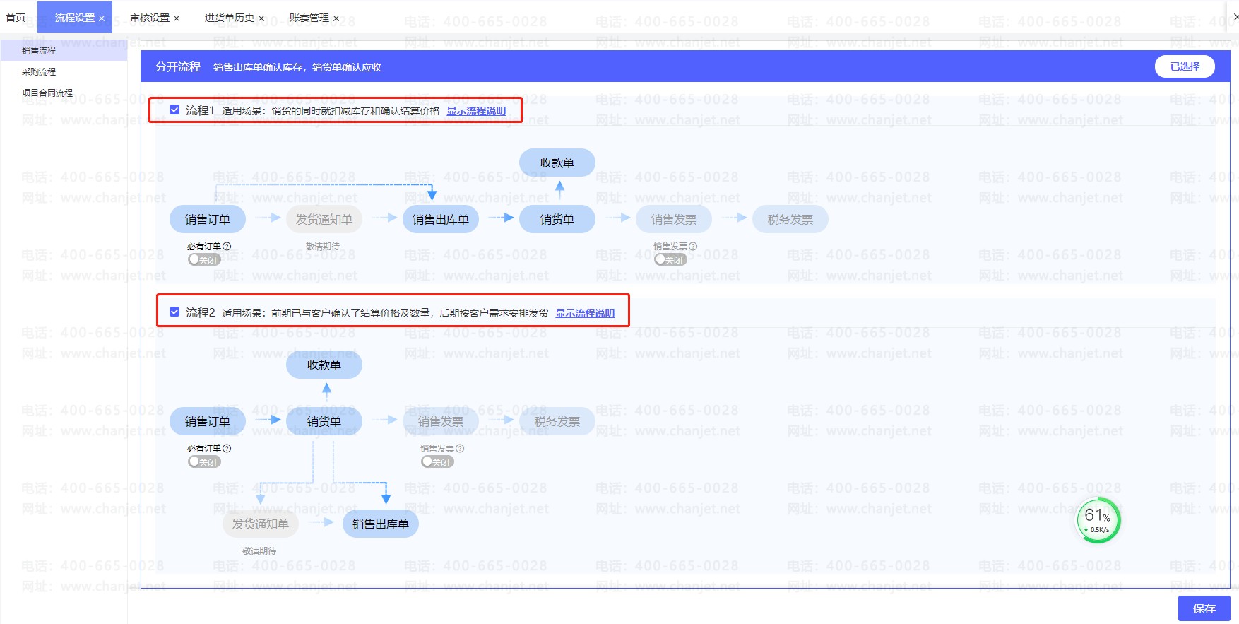 1、用账号密码登录好业财(网址:hyc.chanjet.com),点击【系统管理】-【流程设置】-【销售流程】,其中流程1:适用场景:销货的同时就扣减库存和确认结算价格;流程2:适用场景:前期已与客户确认了结算价格及数量,后期按客户需求安排发货,根据自己的实际业务需求选择自己合适的流程(注意:目前仅好业财专业版支持该功能)