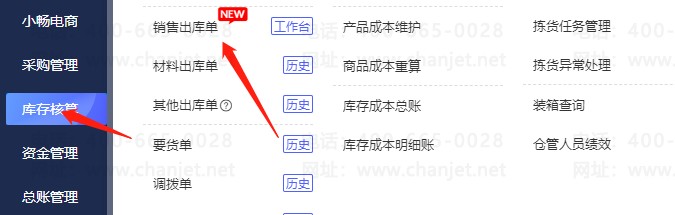 3、切换后,刷新浏览器(快捷键:F5),点击【库存核算】-【销售出库单】,根据实际出库商品手动增加出库单,根据流程1或者流程2,右上角增加了选单:销售订单或者销货单,也可以销售订单和销货单保存后点击右上角生单出库