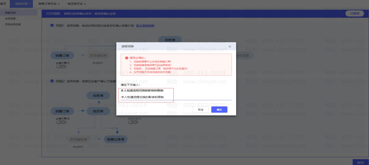 2、点击保存,会弹出一个确认修改按钮,输入这段文字,点击确定,输入应用管理员的密码(注意:1、切换前需要中止未完的销售订单!2、切换前确保销货单已经全部审核!3、切换后 ,历史销售订单、销货单不允许反操作!4、分开流程不支持切换到合并流程!)
