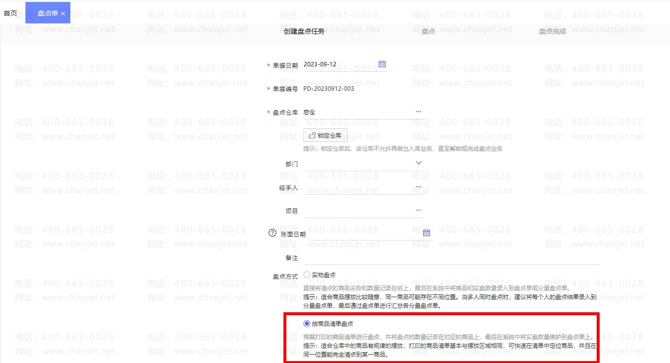 1、点击【库存核算】-【盘点单】,创建盘点任务,选择对应的仓库,盘点方式选择按商品清单盘点。