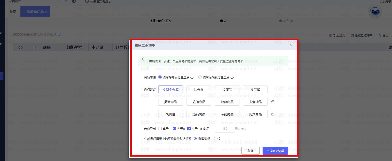 2.使用“商品清单盘点”时,可选择商品来源与盘点建议,可以设置实盘数量默认值,然后点生成盘点清单,会有商品明细。
