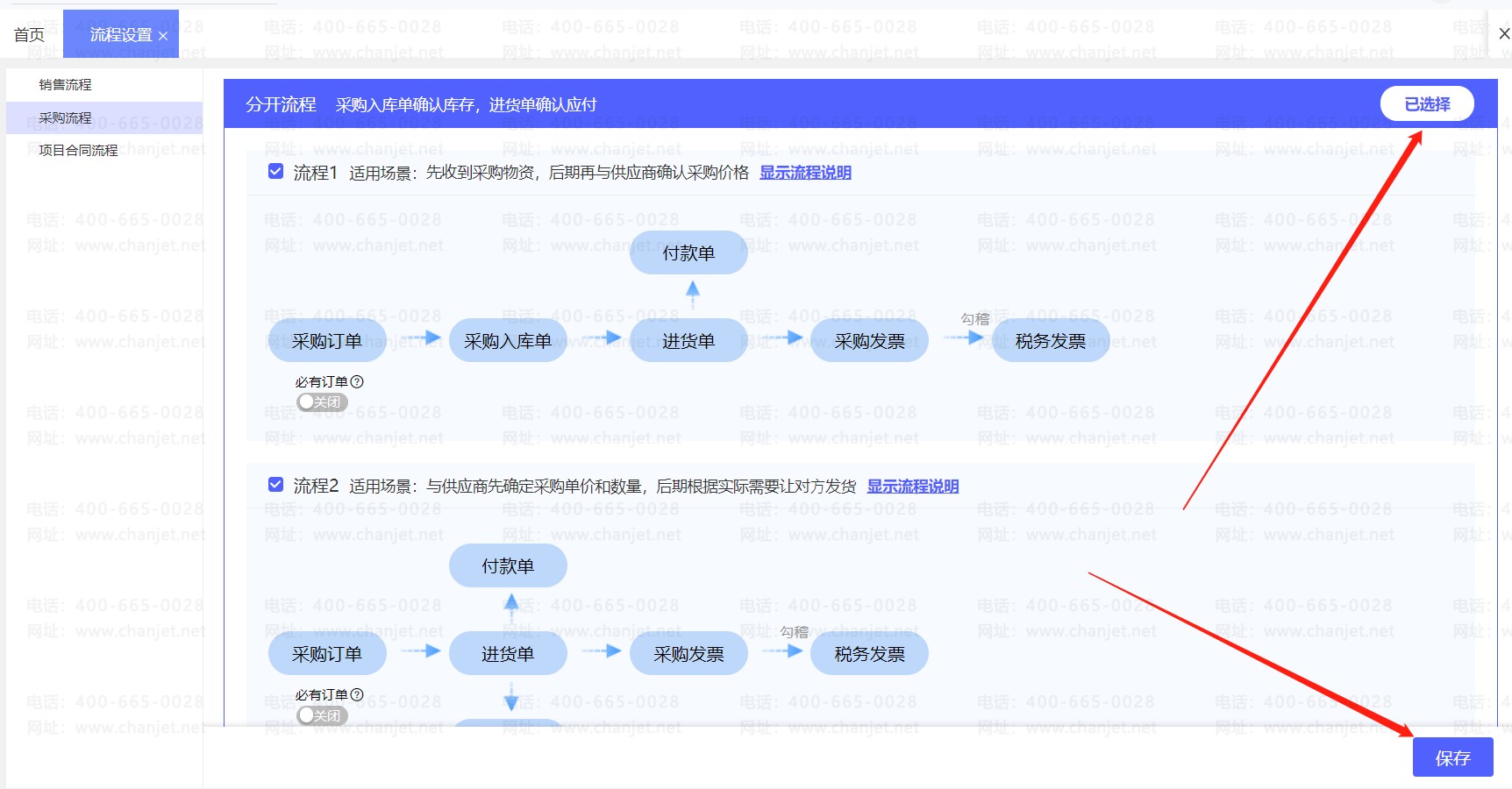 2、采购流程,选择【分开流程】,选择之后点击【保存】