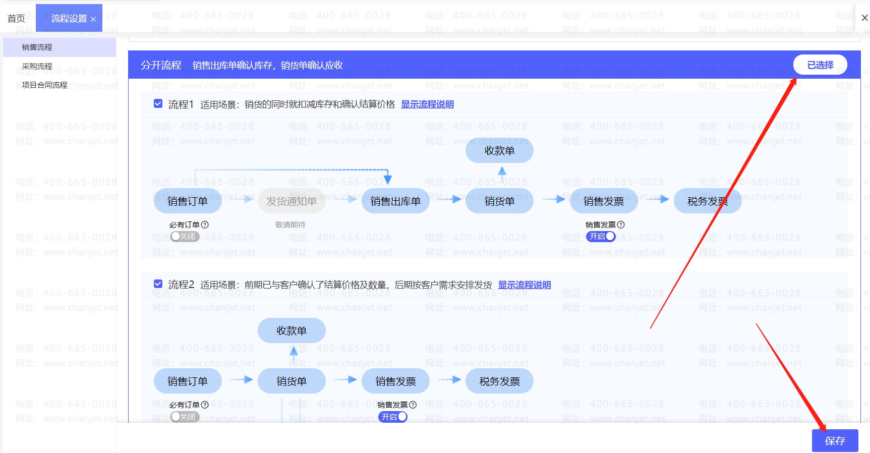 2、找到【销售流程】,选择【分开流程】,设置好之后点击【保存】