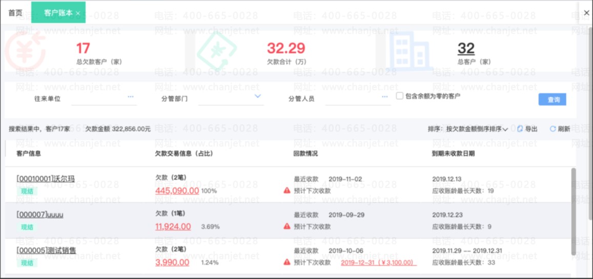 查询客户截止到当前时点的欠款金额。可查询欠款的客户总数量和欠款总金额。点击客户欠款总金额可联查该客户的往来单据明细。