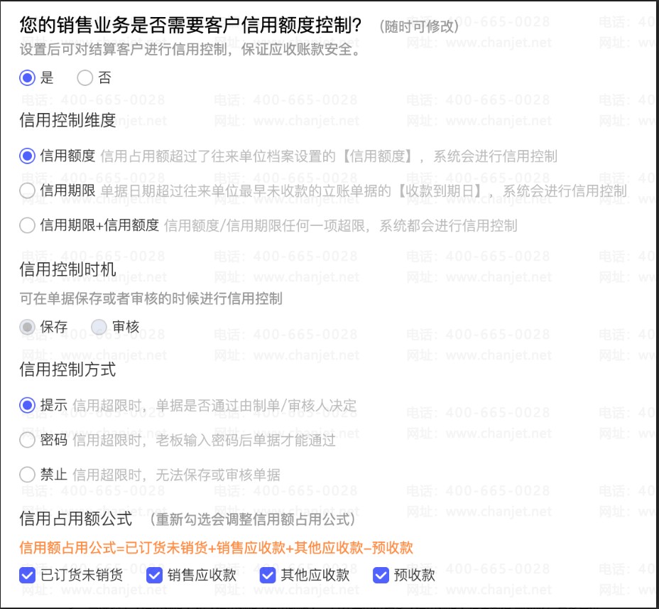 信用控制:对结算客户进行信用控制,根据信用检查点,在保存、审核时对销售订单、销货单、其他收入单(控制信用的单据)进行控制,若当前客户的应收账款余额超过了该客户档案中设定的信用额度,应收账款期间超过了收款到期日,系统提示当前客户已超信用,并根据需要进行控制。