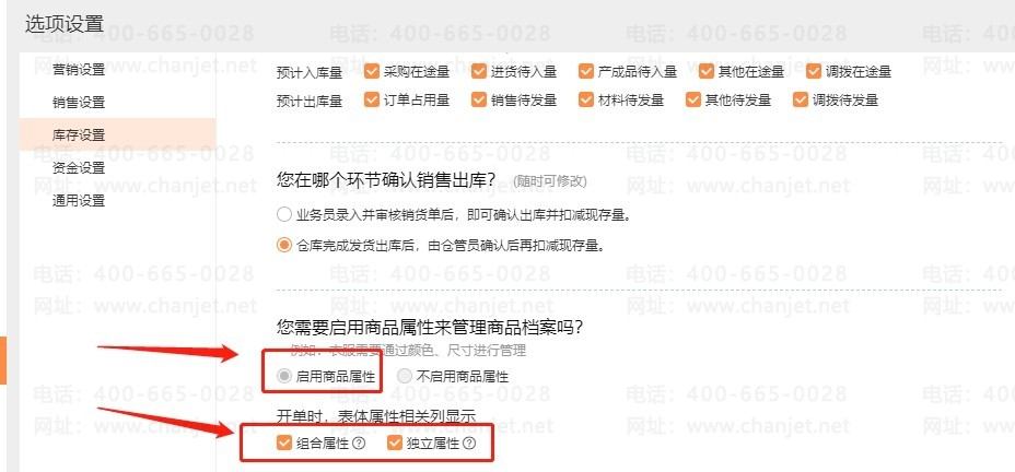 进入【系统管理】-【选项设置】-【库存设置】里面找到【您需要启用商品属性来管理商品档案吗?】勾选【启用商品属性】,可以根据自己需求选择【独立属性】还是【组合属性】