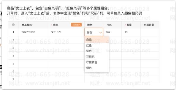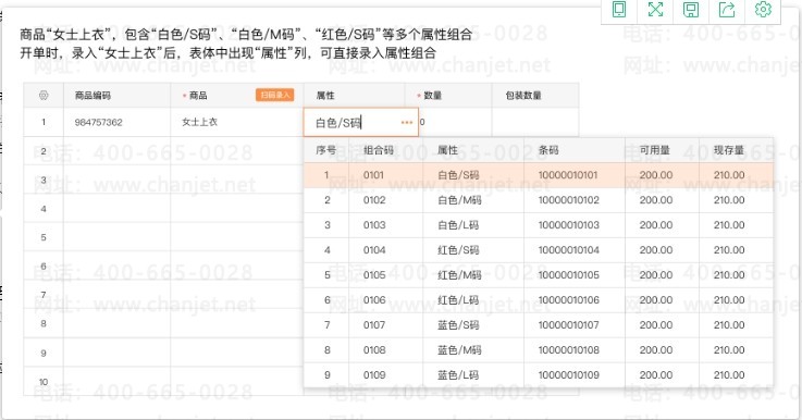 组合属性:例如“女士上衣”包含“白色/S 码”、“白色/M 码”、“红色/S 码” 等多个属性组合开单时,录入“女士上衣”后,表中会出现“属性”列,直接录入属性组合。