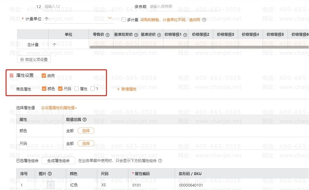 举例说明:服装行业,衣服有黄色,蓝色,白色;尺码有 S、L、M 等,需要做单的时候,可以自己选择属性,体现在单据上面,还需要根据不同的属性来定价。下面是操作步骤: