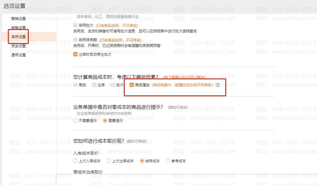 a、进入【系统管理】-【选项设置】-【库存设置】,找到【您计算商品成本时, 考虑以下哪些因素】中勾选【商品属性】