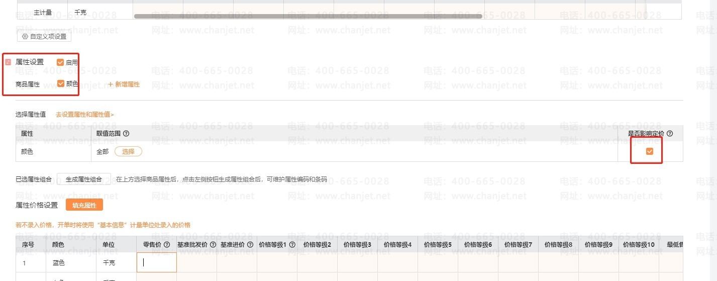 b、进入【基础信息】-【商品】商品档案,勾选启用属性,后面会出现是否影响定价按钮,勾选上,下面点击【填充属性】就可以按照不同属性设置零售价,基准进价等,如下图: