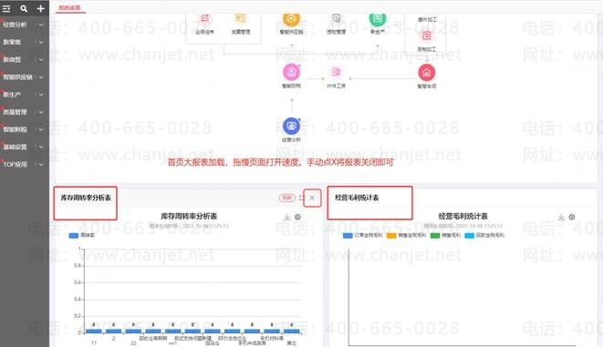 12、首页打开慢,这种情况一般是因为首页有库存周转率分析表和经营毛利统计表加载。这两个报表会比较耗时,导致首页首页打开慢。解决方案,将首页报表关闭即可。