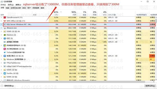 如果sqlserver给分了很大内存(比如13000M),但是在资源管理器里边查看,sqlserver服务只占了很少内存。说明:sqlserver的管理用户没有锁定内存页,这样会导致所有查询走磁盘读写,严重影响效率。如图: