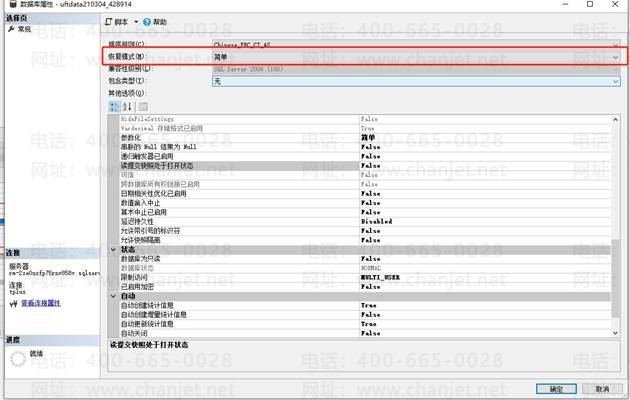 专属云版本模式下(默认是简单模式),数据库恢复模式都要设置为简单,否则会出现日志文件超大,占用大量磁盘空间的情况。选择账套库,右键属性