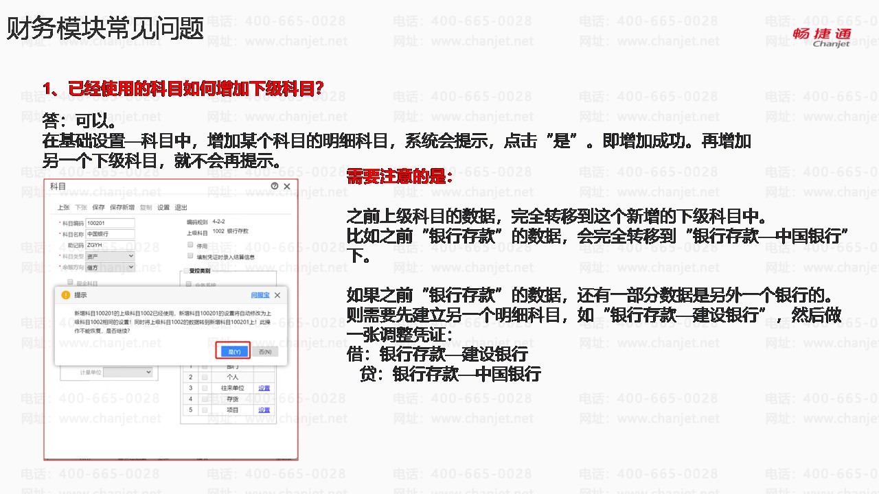 在基础设置—科目中,增加某个科目的明细科目,系统会提示,点击“是”。即增加成功。再增加另一个下级科目,就不会再提示。