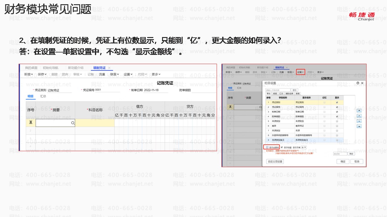 2、在填制凭证的时候,凭证上有位数显示,只能到“亿”,更大金额的如何录入?