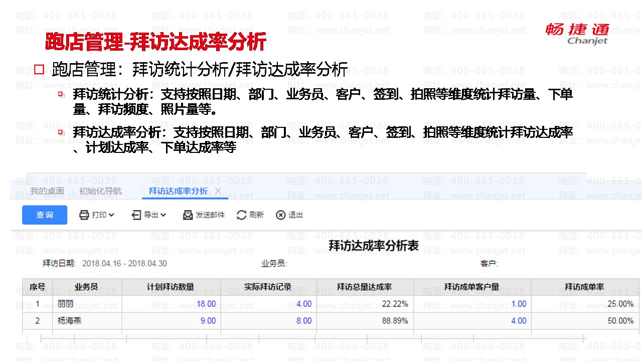 拜访达成率分析:支持按照日期、部门、业务员、客户、签到、拍照等维度统计拜访达成率、计划达成率、下单达成率等