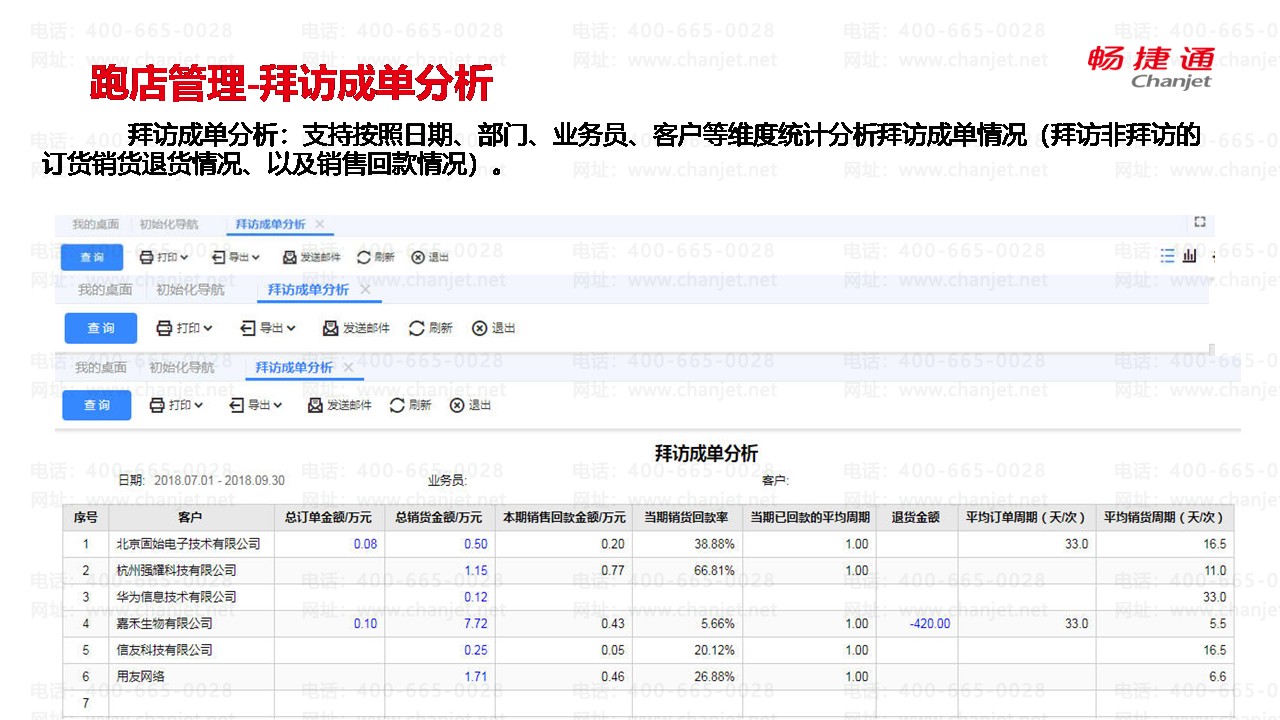 拜访成单分析:支持按照日期、部门、业务员、客户等维度统计分析拜访成单情况(拜访非拜访的订货销货退货情况、以及销售回款情况)。