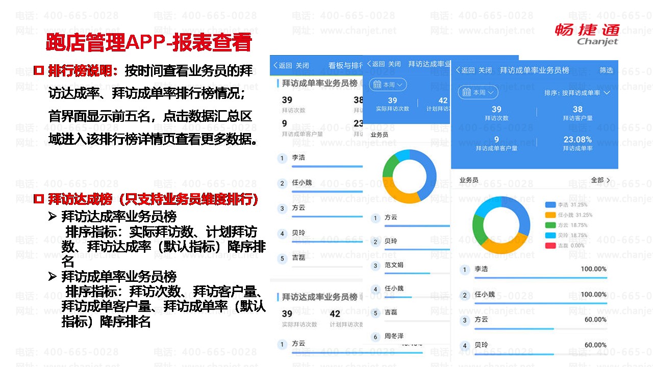 看板说明:按时间体现拜访业务的达成率、成单率;按拜访达成率显示前五名,点击“查看全部业务员(部门)排行”可联查拜访达成业务员(部门榜)