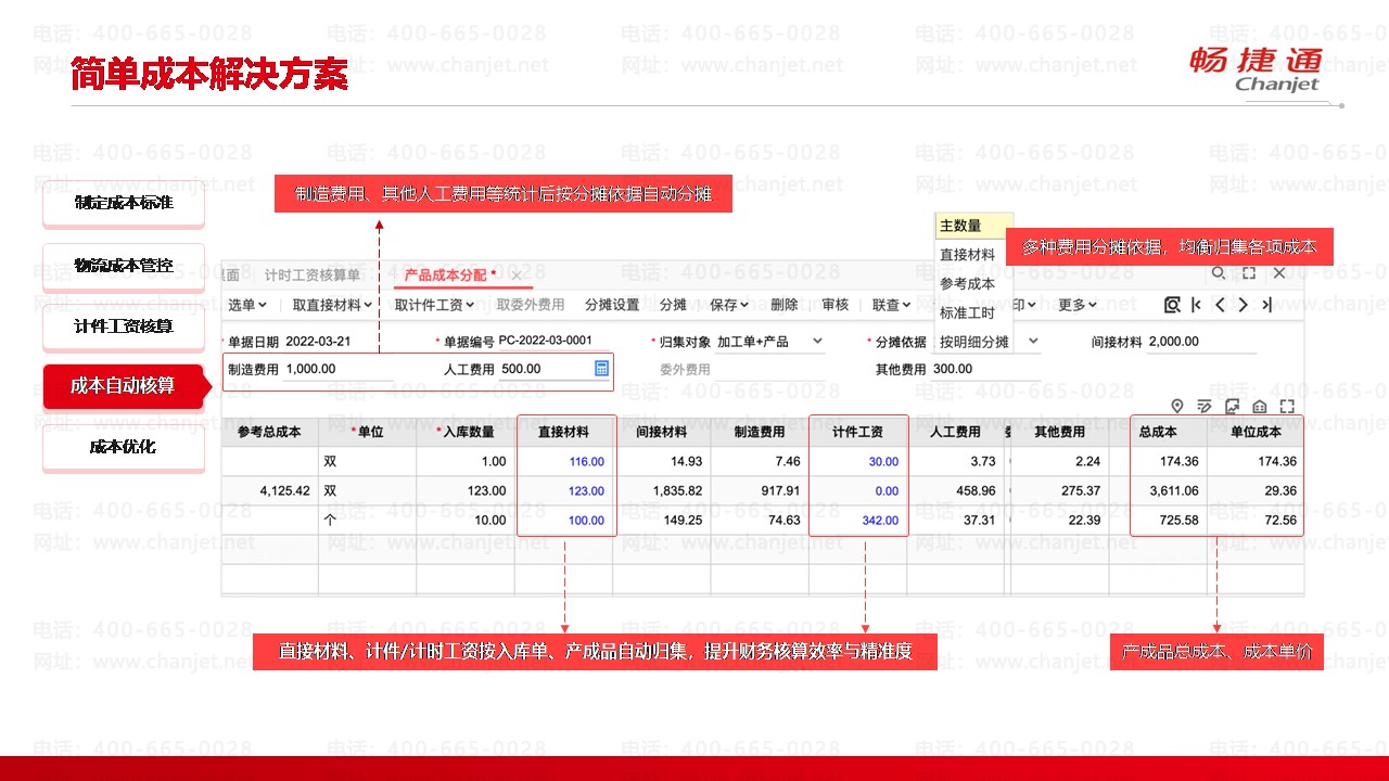制造费用、其他人工费用等统计后按分摊依据自动分摊
