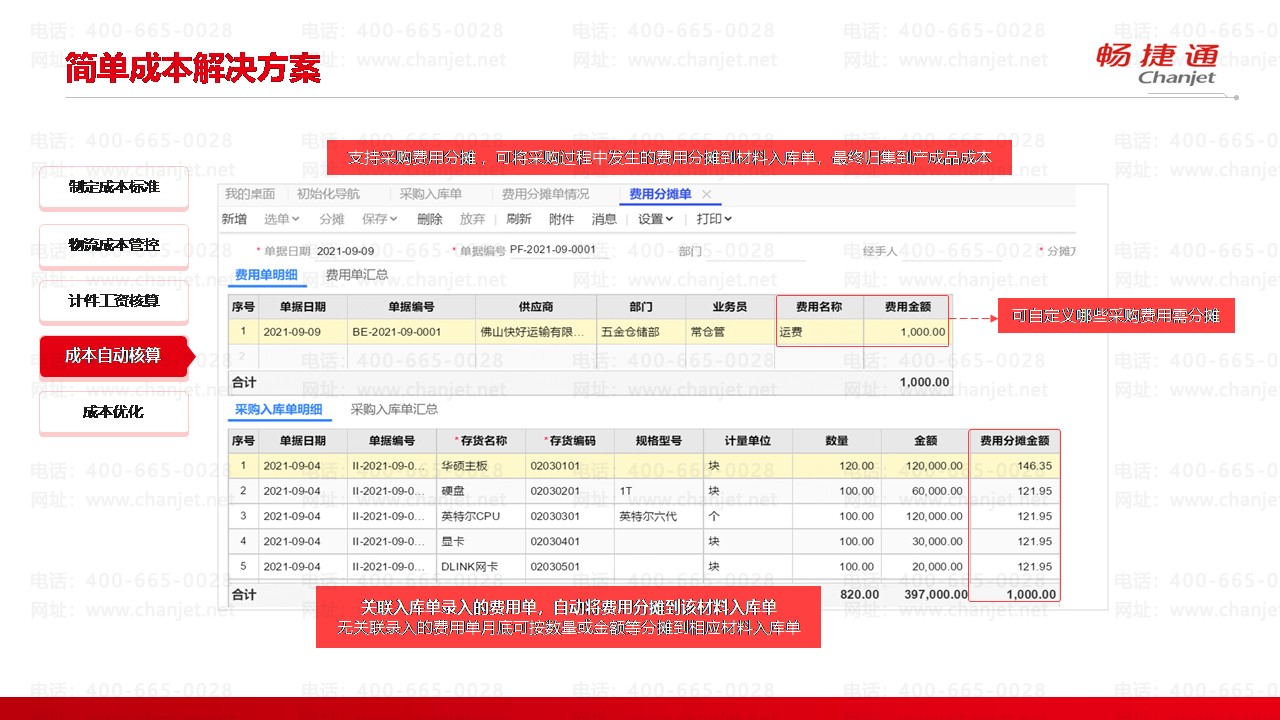 支持采购费用分摊 ,可将采购过程中发生的费用分摊到材料入库单,最终归集到产成品成本