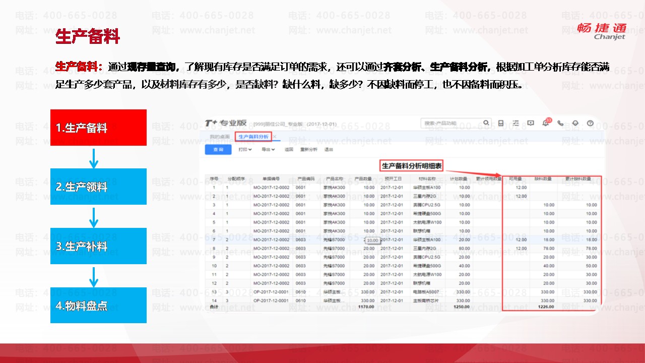 生产备料:通过现存量查询,了解现有库存是否满足订单的需求,还可以通过齐套分析、生产备料分析,根据加工单分析库存能否满足生产多少套产品,以及材料库存有多少,是否缺料?缺什么料,缺多少?不因缺料而停工,也不因备料而积压。