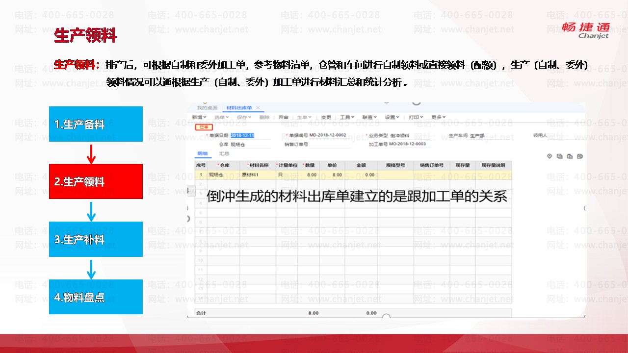 生产领料:排产后,可根据自制和委外加工单,参考物料清单,仓管和车间进行自制领料或直接领料(配额),生产(自制、委外)