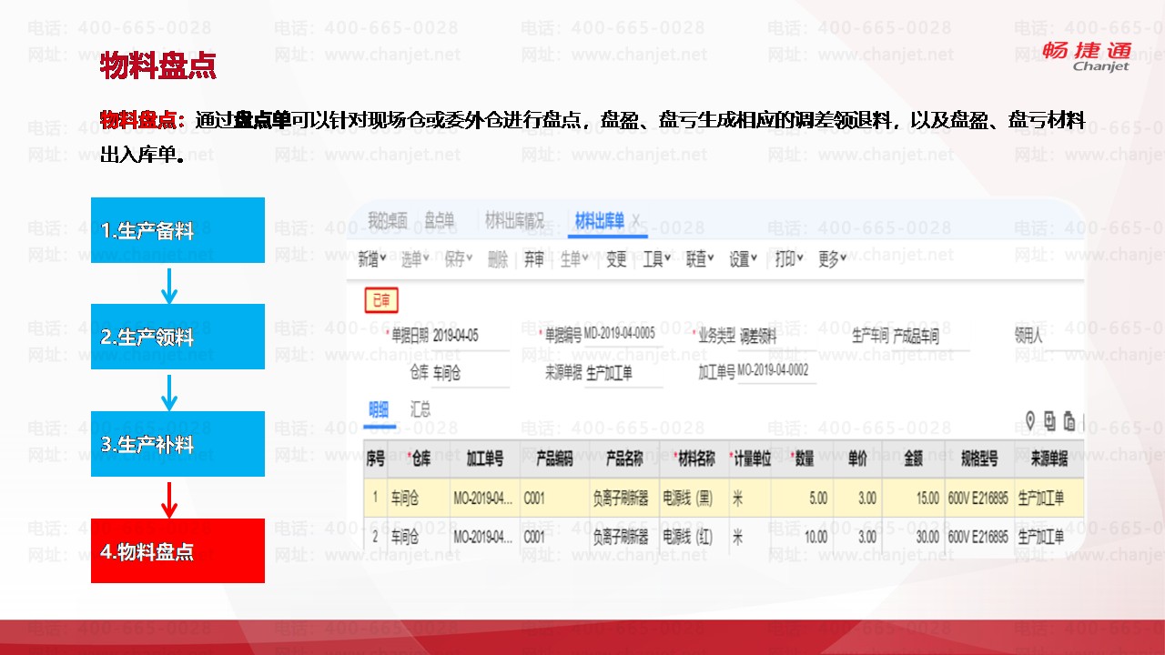 物料盘点:通过盘点单可以针对现场仓或委外仓进行盘点,盘盈、盘亏生成相应的调差领退料,以及盘盈、盘亏材料出入库单。