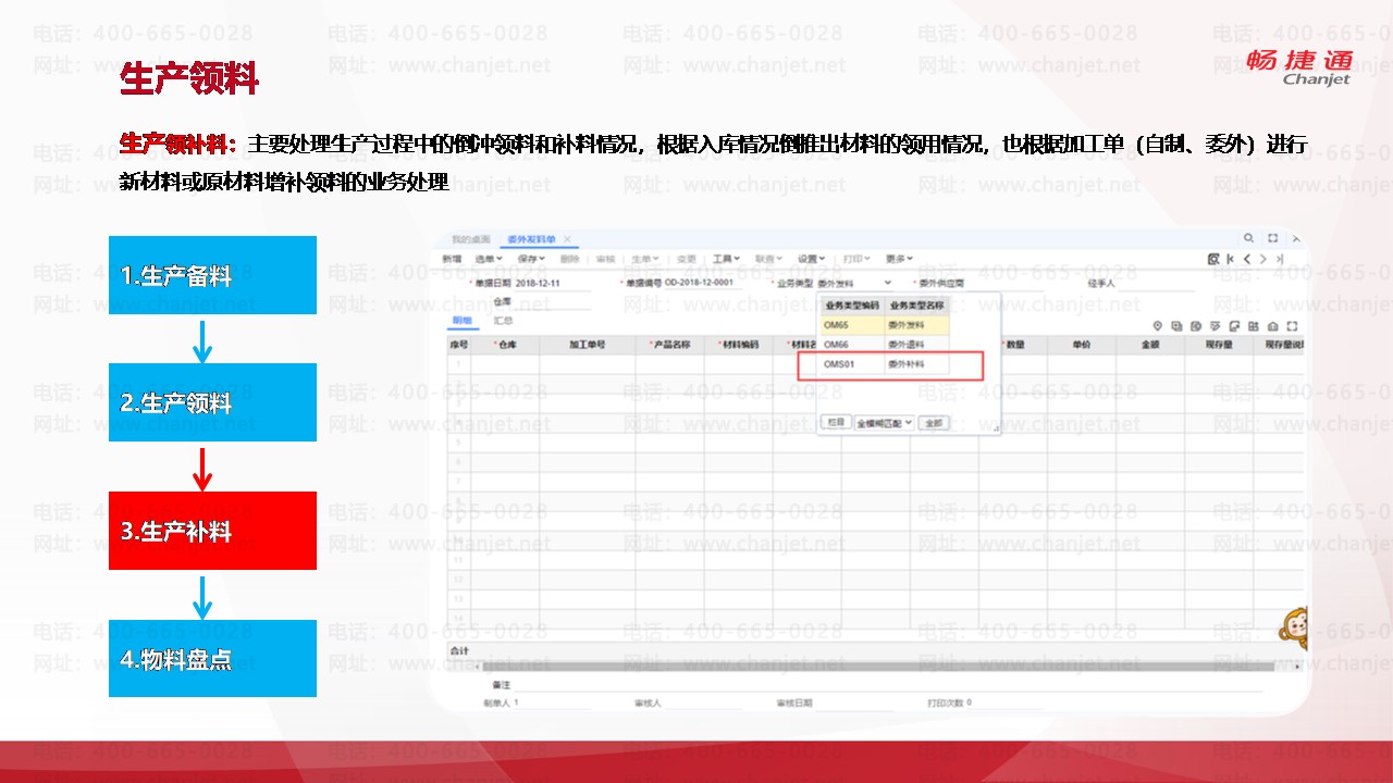 生产领补料:主要处理生产过程中的倒冲领料和补料情况,根据入库情况倒推出材料的领用情况,也根据加工单(自制、委外)进行新材料或原材料增补领料的业务处理