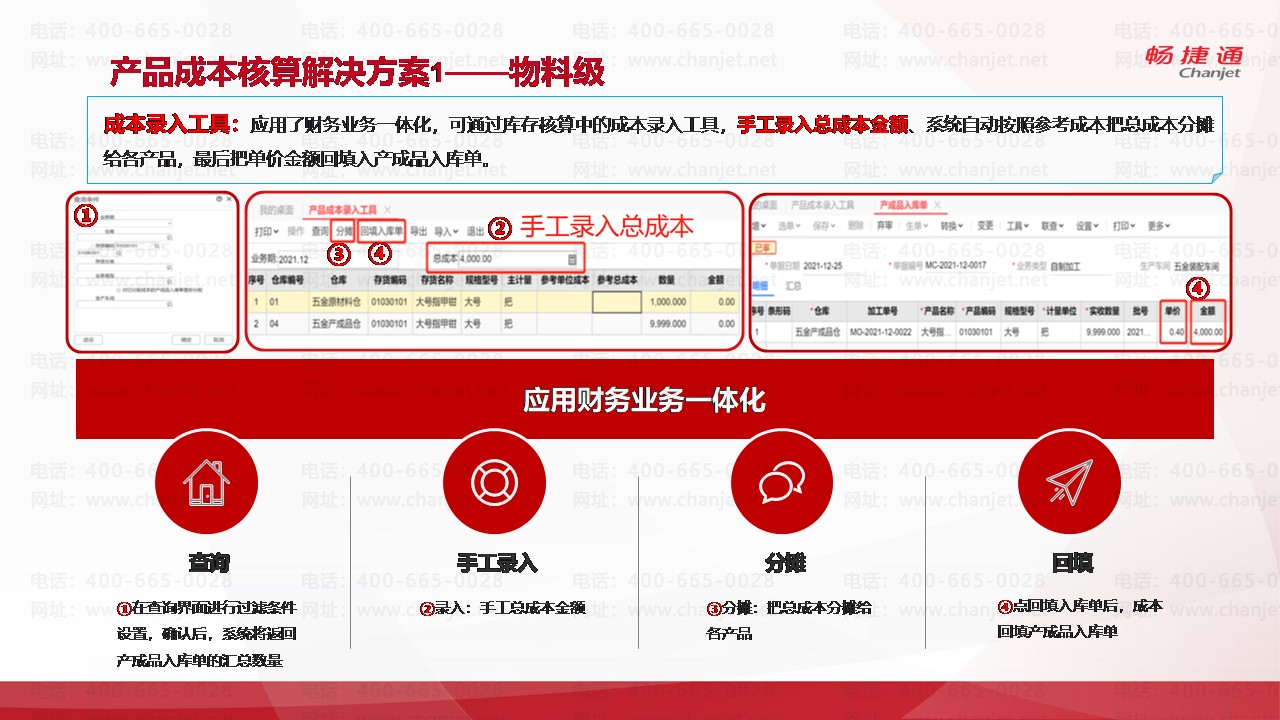成本录入工具:应用了财务业务一体化,可通过库存核算中的成本录入工具,手工录入总成本金额、系统自动按照参考成本把总成本分摊给各产品,最后把单价金额回填入产成品入库单