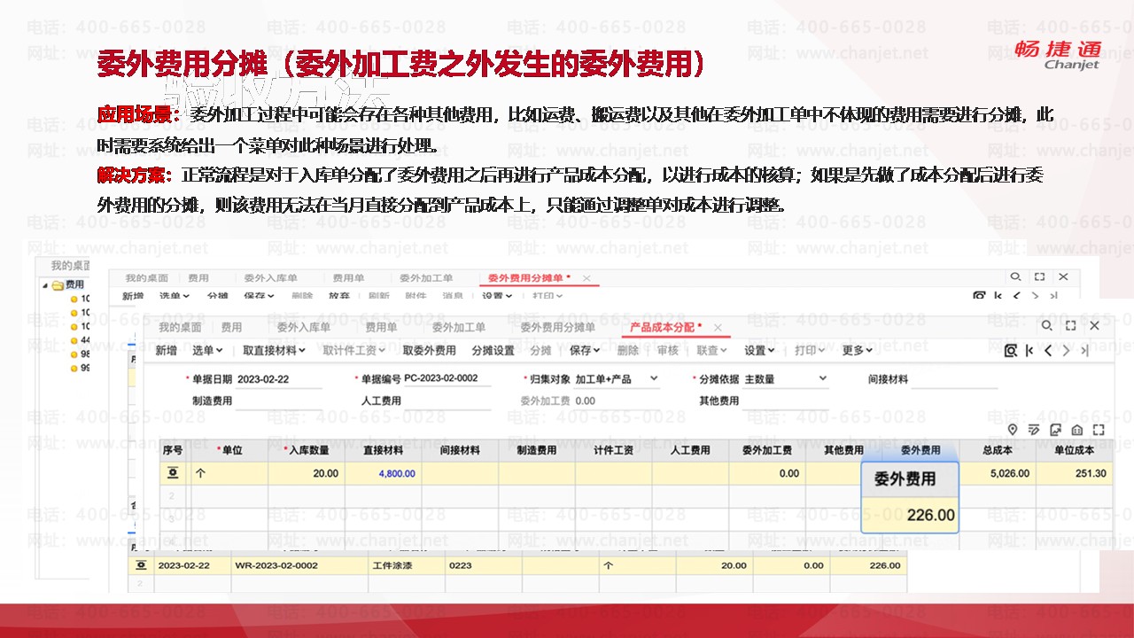 解决方案:正常流程是对于入库单分配了委外费用之后再进行产品成本分配,以进行成本的核算;如果是先做了成本分配后进行委外费用的分摊,则该费用无法在当月直接分配到产品成本上,只能通过调整单对成本进行调整。