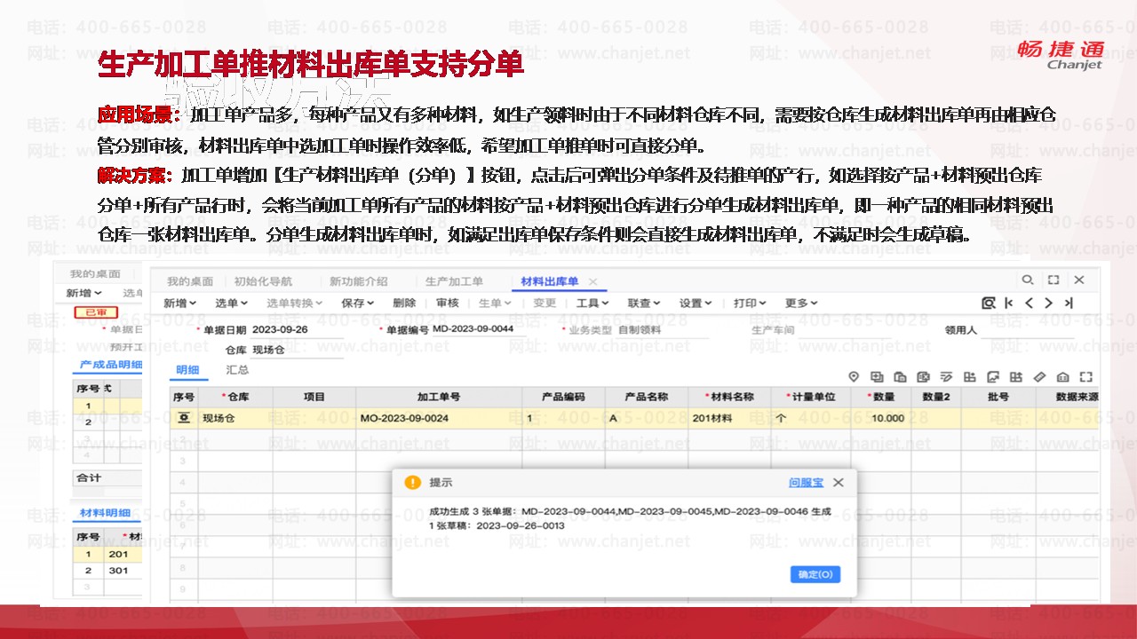 应用场景:加工单产品多,每种产品又有多种材料,如生产领料时由于不同材料仓库不同,需要按仓库生成材料出库单再由相应仓管分别审核,材料出库单中选加工单时操作效率低,希望加工单推单时可直接分单。