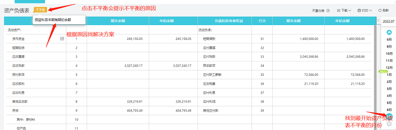 进入【报表中心】-【资产负债表】,点击右边的时间轴找到资产负债表不平衡的原始月份,最后把鼠标放在【不平衡】3个字上查看一下不平衡的原因,根据原因来调整报表,最后调整至报表平衡。