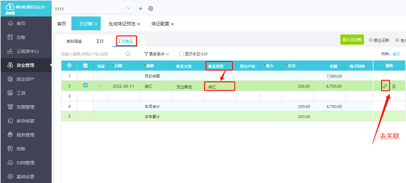 此时,只需要将外币账户中该流水的收支类型改为【结汇】,就可以去关联金额不等的人民币账户,其他其他操作与第一种情况一致。