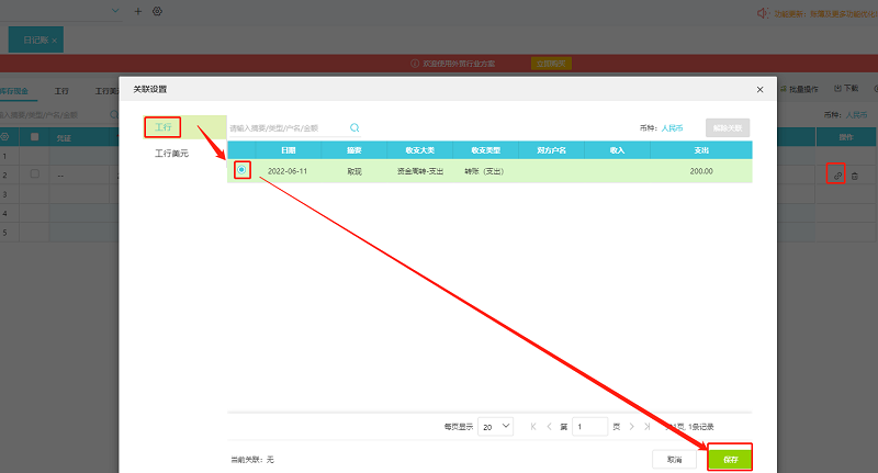 2、选择需要关联的另一条流水记录,点击【保存】,进行关联。