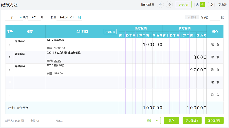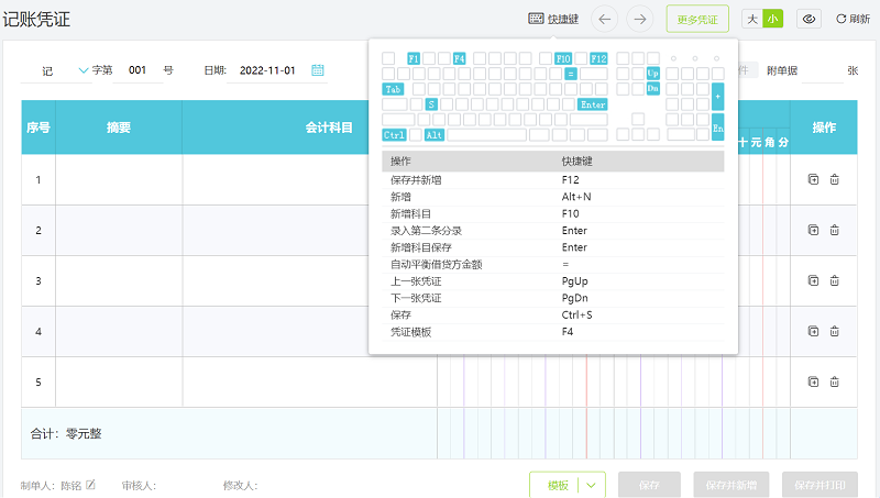 PS:常用凭证可以根据具体业务的相似度进行修改或新增,明细科目、辅助核算项目、金额等信息也可以保存。