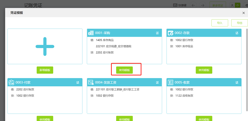 1.点击【总账】-【新增凭证】进入记账凭证页面,点击【模板】-【使用模板】或使用快捷键“F4”,调用已有的存款凭证模板。