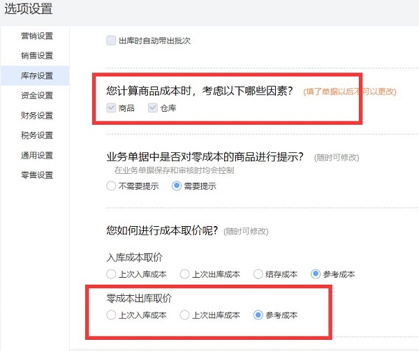 1.【系统管理】-【选项设置】-【库存设置】中【零成本出库取价】选择【参考成本】且成本计算【按仓库+商品核算】:
