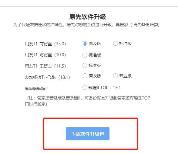 点击账套中【新手引导】-【初始设置】,如果当前源数据不是支持的版本, 可以点击【下载软件升级包】,将源数据升级后再操作,