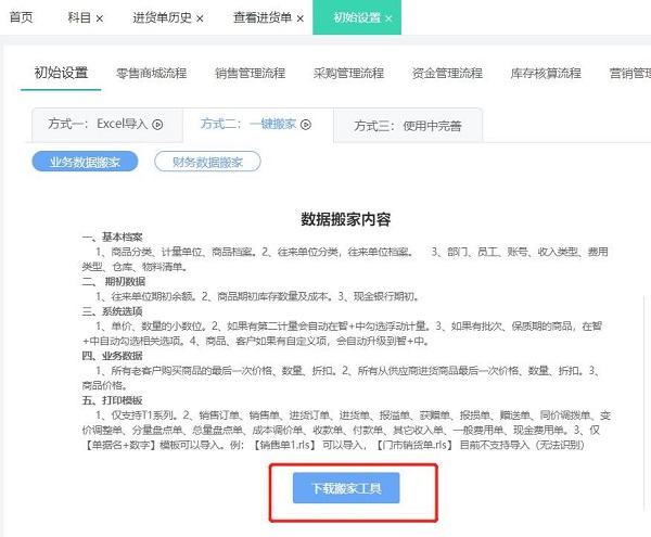 搬家工具用于从现有系统中直接导入,包括用友 T1-商贸宝(13.0)、用友 T1- 财贸宝(10.0)、友加畅捷 T1-飞跃(18.1)、管家婆辉煌系列 II TOP13.4 产品,如果要导入的源文件低于支持的版本,可以搬家工具中下载最新程序升级后再操作;
