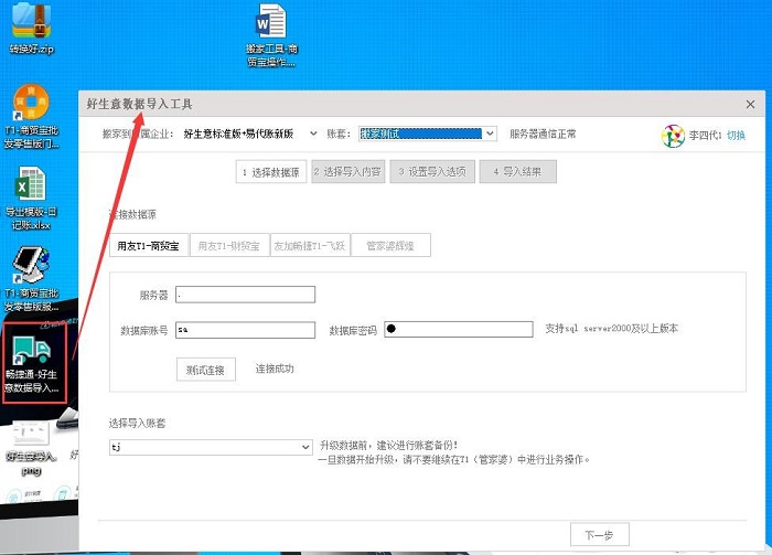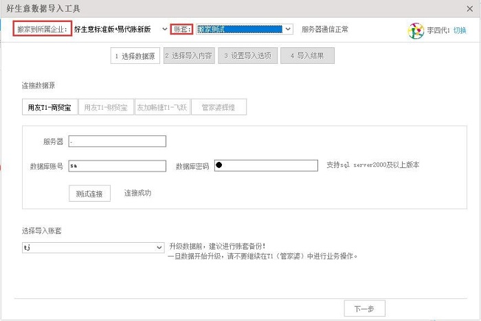 选择数据源,以 T1 商贸宝 13.0 为例,输入服务器、数据库账号和数据库密码, 然后点击测试连接,连接成功后选择需要导入的账套: