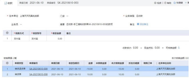 【按单据】核销时,需要在做收款单时选择销货单和销货退货单一起核销