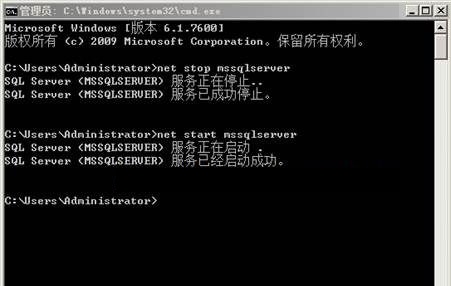 5、点击“开始”-“运行”中输入“CMD”进入DOS窗口,再输入 net stop mssqlserver 停止数据库服务,然后再输入 net start mssqlserver 启动数据库服务,如下图所示: