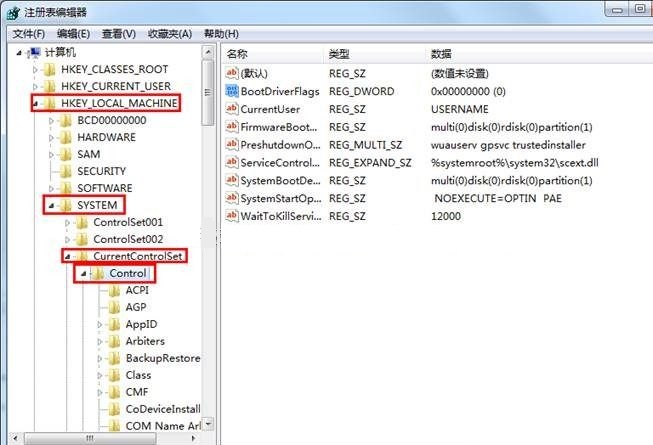 (2)在注册表中找到HKEY_LOCAL_MACHINE\SYSTEM\CurrentControlSet\Control