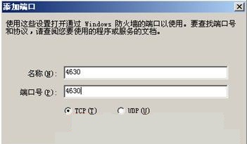 b、在添加端口对话框,名称处输入:4630,端口号输入4630,选择TCP,点击确定;用同样的方法,点击“添加端口”按钮添加1433端口。最后点击“确定”,4630和1433端口就添加好了。