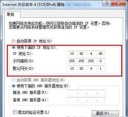 (4)选中“使用下面的IP地址”并输入需要设置的内网IP地址