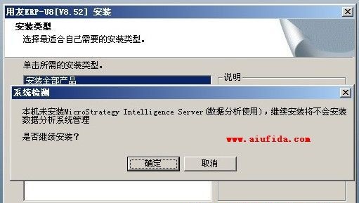 解决方案:由于一般操作系统中都不带有数据分析服务,而用友U852安装时需要安装一些服务要借用数据分析,当系统没有这个服务的时候就会提示本机未安装MicroStrategy Intelligence Server(数据分析器使用),继续安装将不会安装数据分析系统管理,是否继续安装?这个问题同样我们直接点击确定按钮跳过就可以了,不用管他!