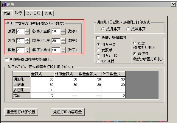 1、总账选项设置问题,操作步骤(本文以用友通T3为例):在“总账”--“设置”--“选项”中账簿页签,将打印位数宽度调宽一点,比如都调为20,如下图所示: