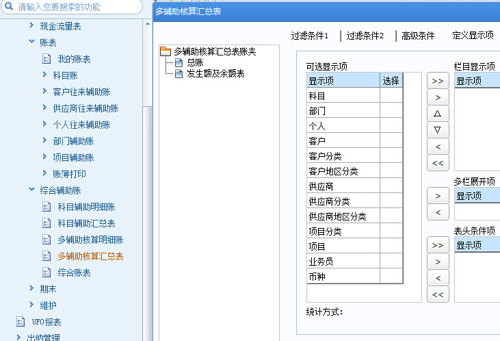 3、查询可以在总账-帐表下多辅助账查询,自定义显示行列及先后顺序