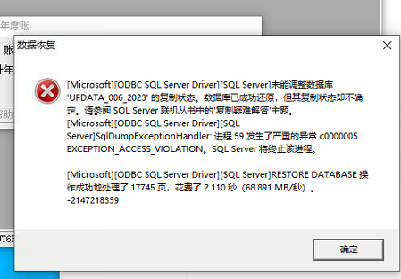 U8或T6建立年度帐提示‘未能调整数据库的复制状态’,数据库已成功还原